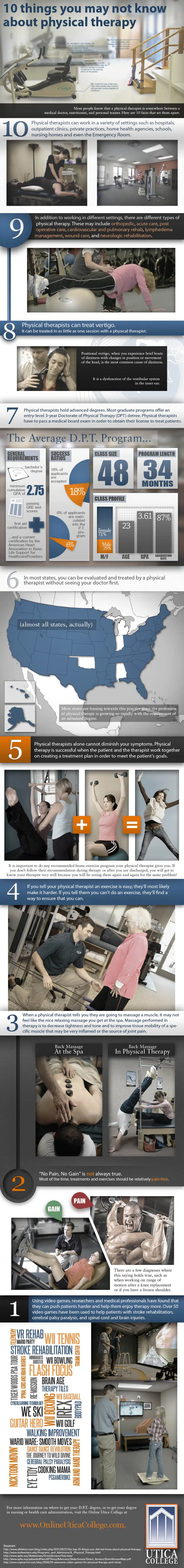 January 17, 2013Most people know that a physical therapist is somewhere between a medical doctor, a nutritionist, and a personal trainer. Utica College has come up with an infographic on some of the key points that you may not know about physical therapy and physical therapists. Physical therapists can work in a variety of settings, and have many different specialties. Physical therapists hold advanced degrees and in most states you can see a physical therapists without consulting your doctor first. Using video games as part of treatment can push the patients harder and help them enjoy therapy more. Take a look at all the 10 things you may not know about physical therapy in the infographic below.